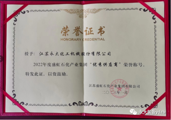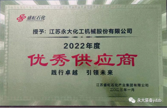 永大裝備被江蘇盛虹石化產(chǎn)業(yè)集團(tuán)有限公司授予優(yōu)秀供應(yīng)商榮譽(yù)稱號(hào)